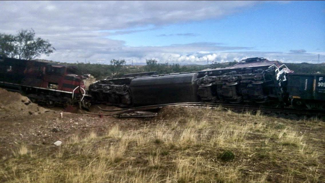 NACO, 9 de Mayo.- Un convoy de vagones cargados con ácido sulfúrico y polvo de cobre se descarrilaron en Sonora, dejando heridos de gravedad al menos tres trabajadores de Ferromex, empresa transportista de la minera Grupo México.