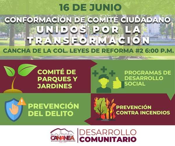Este lunes 16 de junio a las 6:00 p.m. te esperamos en la cancha de la colonia para conformar el Comité Ciudadano “Unidos por la Transformación”.