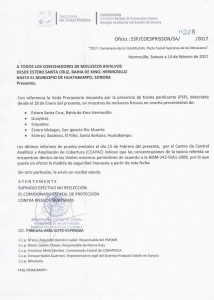 Hermosillo Sonora, 15 de Febrero de 2017.- Luego de permanecer casi un mes en veda precautoria, se levantó la misma y los moluscos frescos provenientes de Bahía de Kino, Guaymas, Empalme, San Ignacio Río Muerto y Huatabampo ya pueden ser consumidos.
