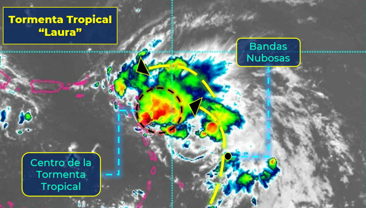 Laura se mueve en dirección este-noroeste a cerca de 21 millas por hora (33 km/h) con vientos máximos sostenidos cerca de las 45 millas por hora (75 km/h).