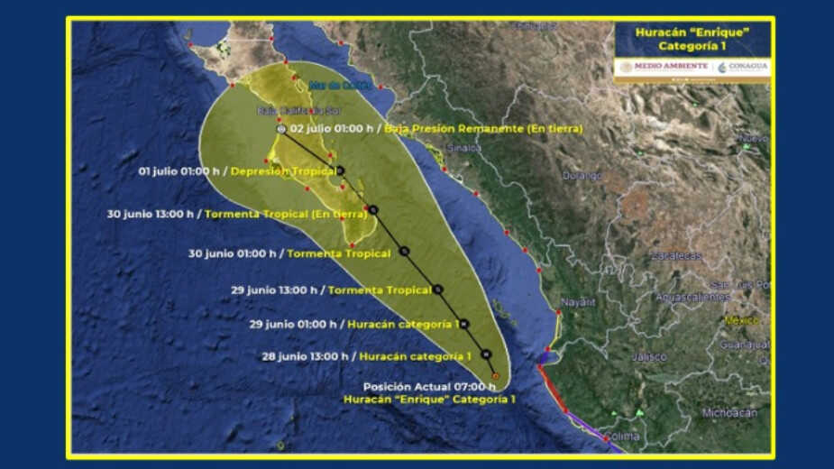 Esta es la trayectoria del huracán Enrique, de categoría 1 en la escala Saffir-Simpson: este lunes se ubica a 75 km al suroeste de Cabo Corrientes, Jalisco y a 120 km al suroeste de Punta Mita, Nayarit; se desplaza hacia el nor-noroeste a 9 kilómetros por hora (km/h), con vientos máximos sostenidos de 150 km/h y rachas de 185 km/h.