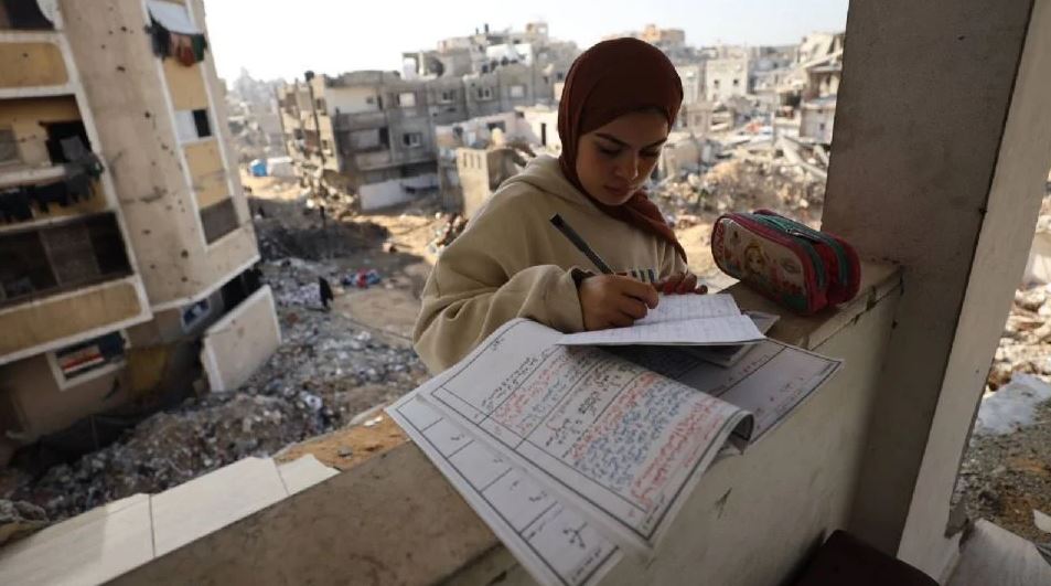 Es una de los 400 niños que asisten a clases en la improvisada Escuela de Educación del Norte, instalada en tiendas de plástico azul en las ruinas de la comunidad de Beit Lahiya, al norte de Gaza, a la vista de la «línea amarilla» que mantienen las fuerzas israelíes.