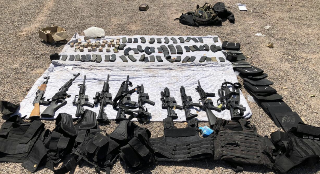 Un informe preliminar indica que en total fueron nueve hombres detenidos, quienes llevaban 10 rifles de asalto como AK-47 y R-15, además de chalecos antibalas, fornituras, más de 50 cargadores para arma larga, así como cajas con cartuchos útiles.