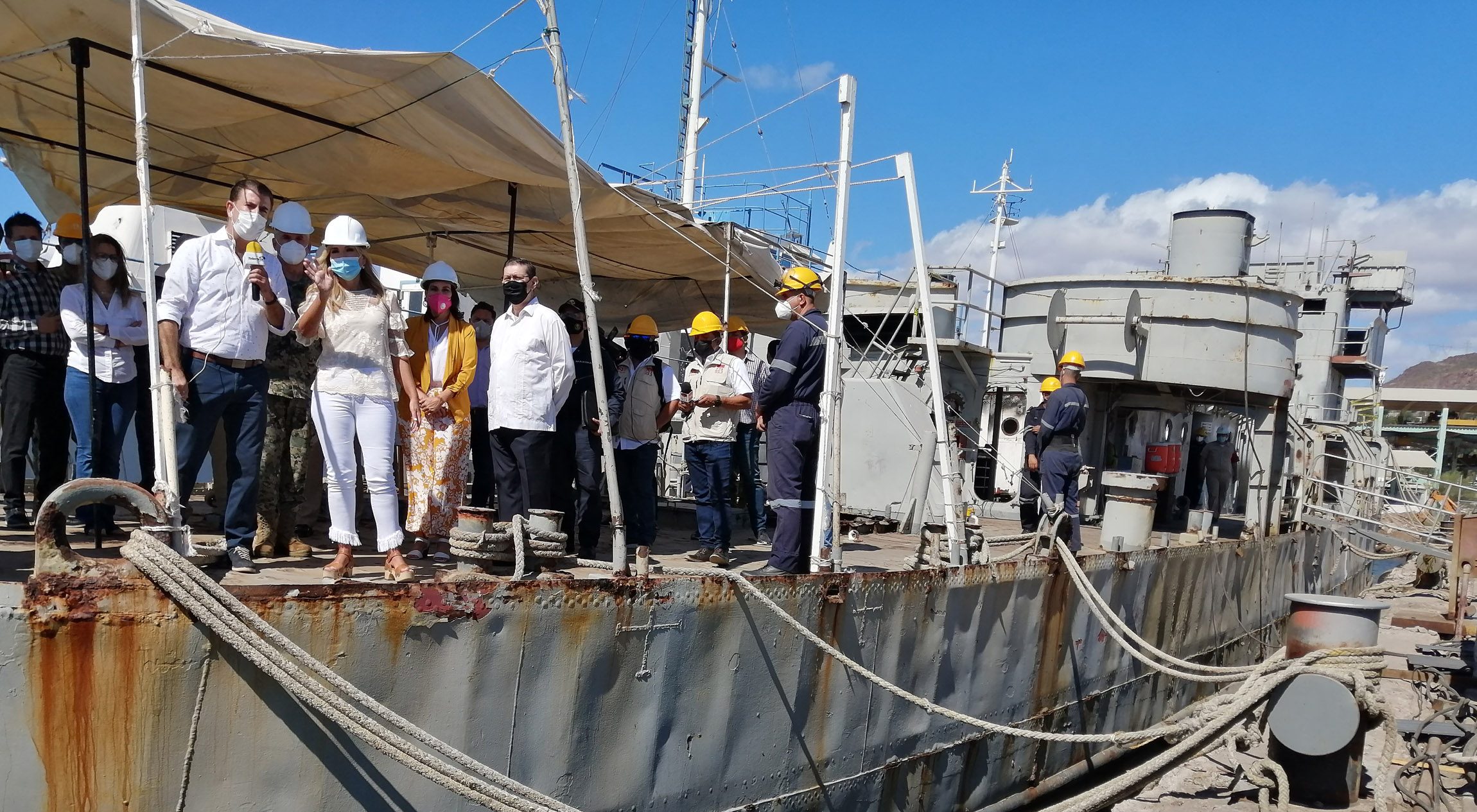 Acompañada por José Tomás Jorge Tress Zilly, comandante de la Cuarta Región Naval; Sara Valle Dessens, presidenta municipal de Guaymas y Miguel Pompa, secretario de Gobierno, la mandataria estatal comentó que este buque tiene una antigüedad de 80 años, 34 de los cuales han sido al servicio de la Marina Mexicana y será hundido la primera quincena de diciembre.