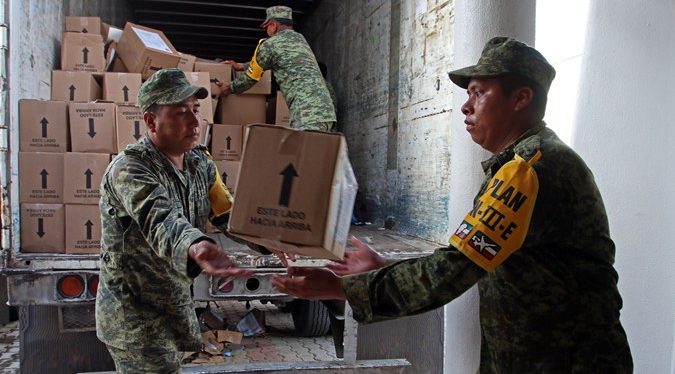 Elementos de la Secretaría de la Defensa Nacional (Sedena) continúan con la implementación del Plan DNIII en la fase de prevención en el municipio de Loreto, Baja California Sur, luego de la llegada de la tormenta tropical Sergio.